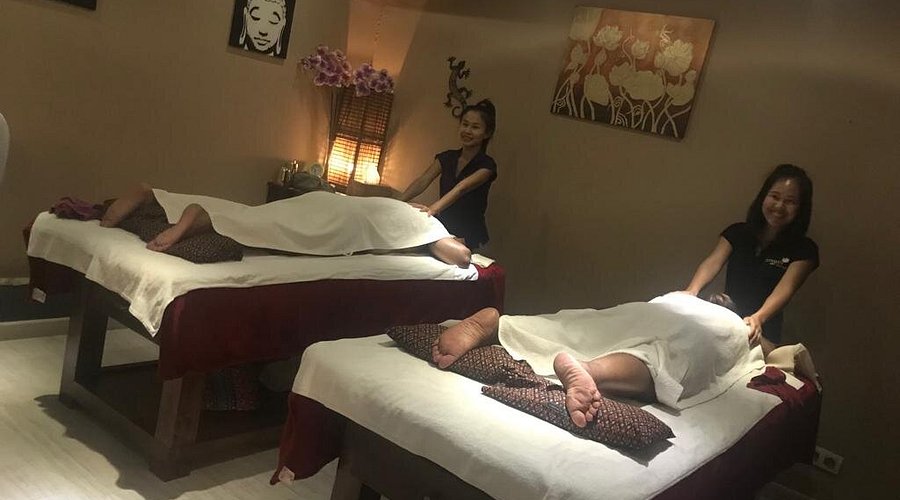 A Thai spa massage uses hands, elbows, knees, feet, and body weight to apply deep pressure and stretch the body, promoting flexibility and relaxation.